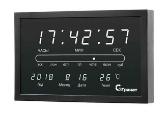 Настенные часы со светящимся табло и термометром Гранат С2502Т-Крупные белые цифры. Отсчитывают секунды. Работают от сети 220В через адаптер. Постоянно светятся. Индикация времени, даты, дня недели, месяца, года, температуры.